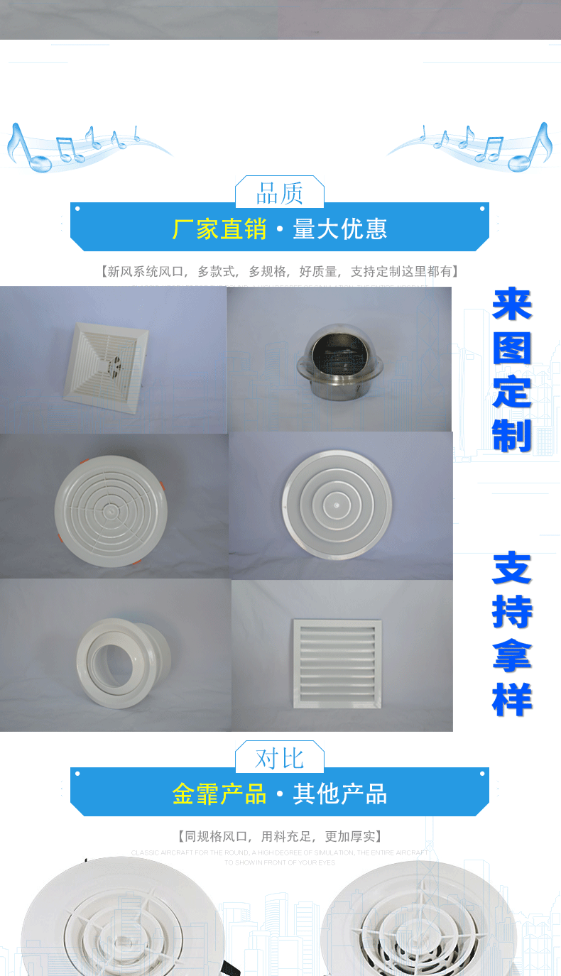 制作:風(fēng)口做成加厚型(外框1.0mm,葉片0.8mm);一般制作都是加厚型的,要薄型的可以跟客服聯(lián)系;也可烤兩遍漆,顏色可按客戶要求進(jìn)行烤制(價(jià)格另計(jì),量大從優(yōu))