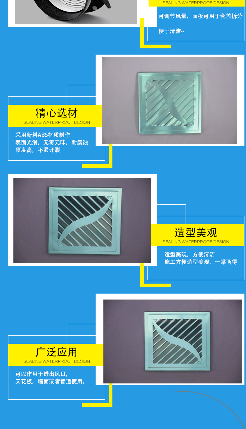 1、可做成正方形或長(zhǎng)方形2、風(fēng)口朝向四面,風(fēng)量可呈四散狀吹出