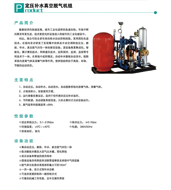 定壓補(bǔ)水脫氣裝置是我公司采用國際先進(jìn)技術(shù)研發(fā)的實(shí)現(xiàn)集中供熱及中央空調(diào)系統(tǒng)定壓、膨脹、補(bǔ)水、真空脫氣四位一體的新型設(shè)備。該設(shè)備在系統(tǒng)中起到穩(wěn)壓、自動(dòng)補(bǔ)水、膨脹自動(dòng)泄水,脫除系統(tǒng)內(nèi)游離氣體及溶解氣體等作用。使系統(tǒng)始終處于高效、環(huán)保、節(jié)能的運(yùn)動(dòng)狀態(tài)。