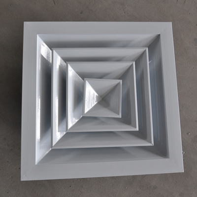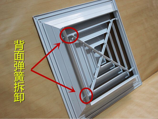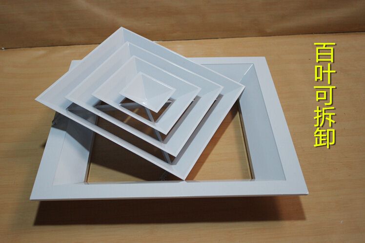方型散流器使用該類型散流器時要與調(diào)節(jié)閥配合使用,才能在系統(tǒng)中得到理想的氣流分布。此風口的葉片角度為固定式,不能隨意調(diào)節(jié),整個葉片與邊框采用分離結(jié)構(gòu)